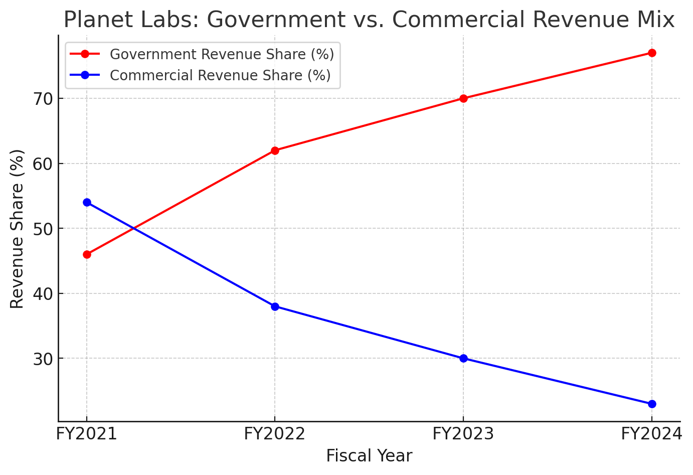 Planet’s **revenue mix has flipped to approximately 75% government vs. 25% commercial as of 2024**.\