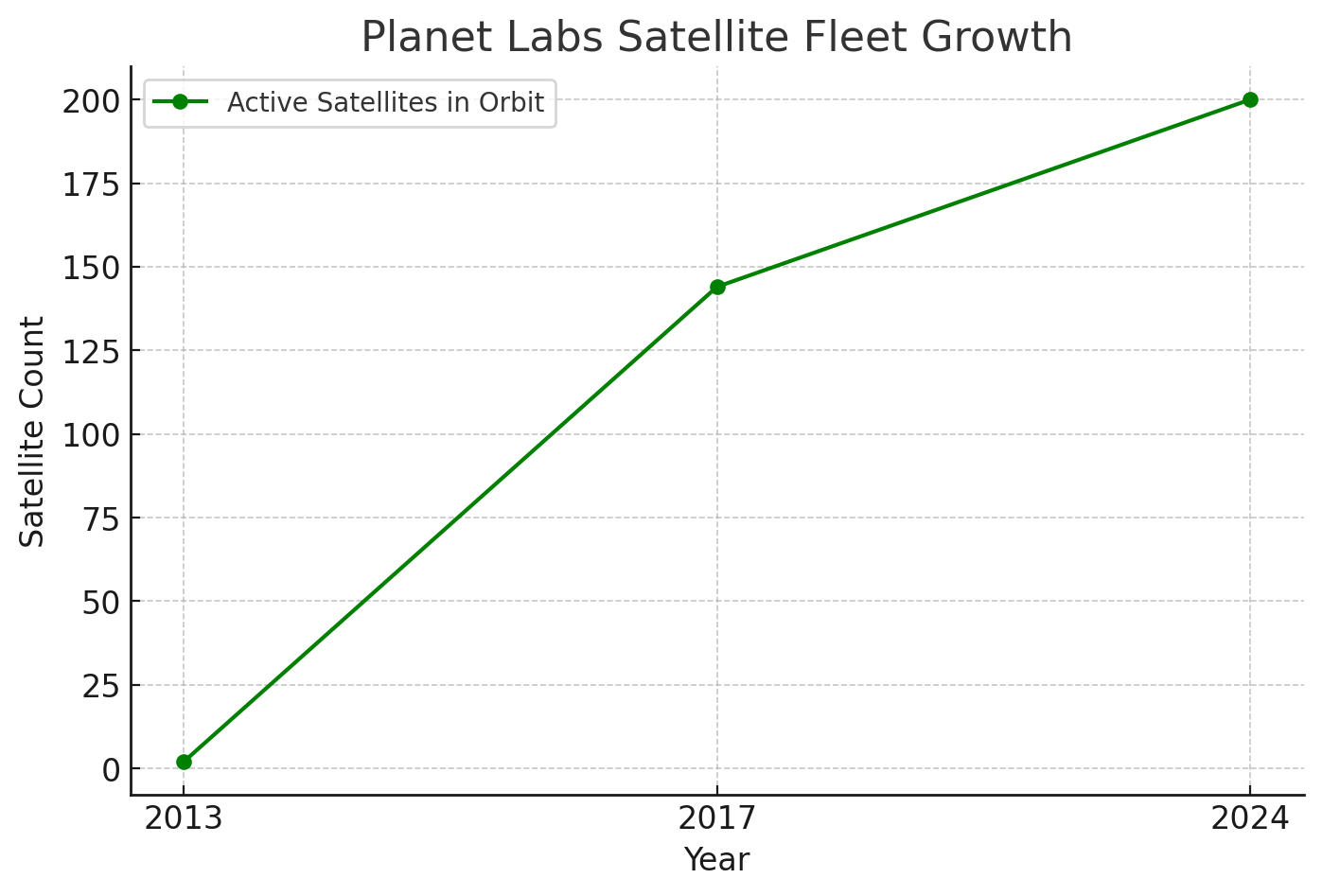 Planet’s **satellite constellation scaled from a handful in 2013 to \~200 in orbit today**, with **500+ total satellites launched to date**.\